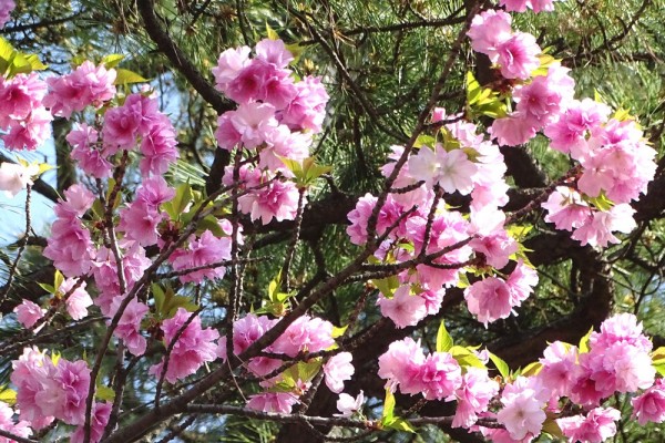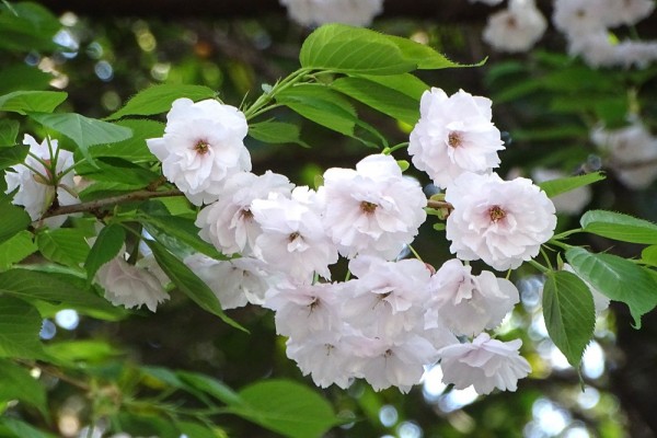 清新町緑道のカモメ橋に近い所に里桜のベニユタカ(紅豊)、ショウゲツ(松月)、