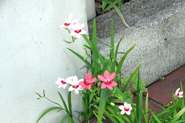 ●これも北葛西の民家の玄関に白とピンクのヒメヒオウギ(姫檜扇)が咲いてい