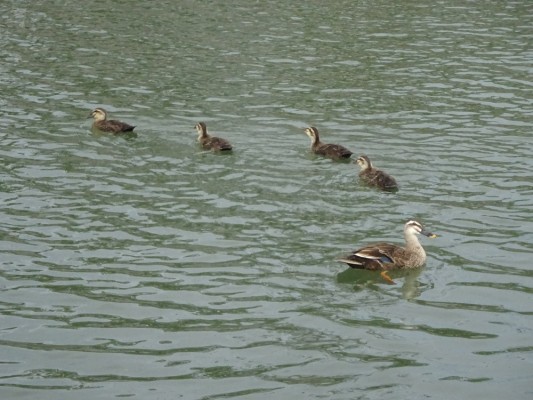 - 新川にカルガモの雛が5羽、親鳥の周りで泳いでいました。