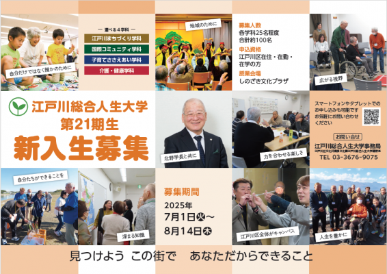 江戸川総合人生大学では7月1日(火)より、10月から入学する新入生(第21期生)を募集します!