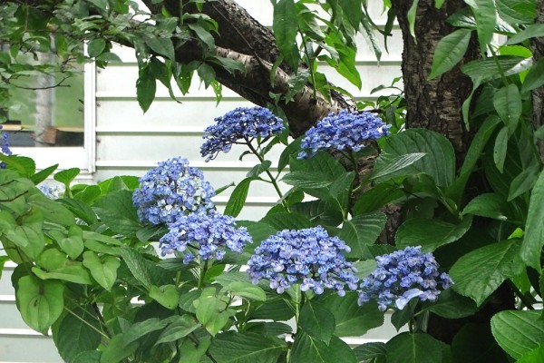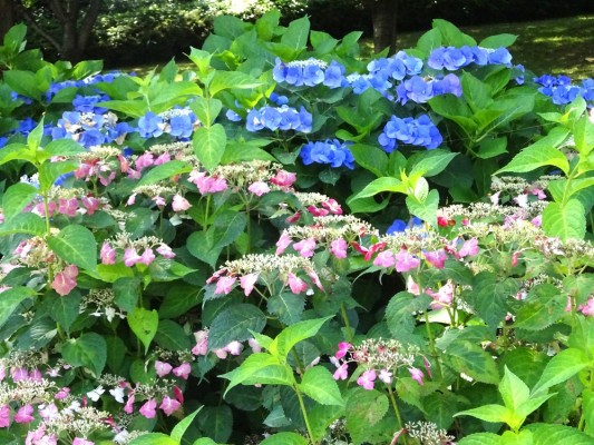 - ブルーのガクアジサイと赤のヤマアジサイが上下になって咲いています。