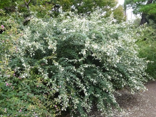 - 同じ日に行船公園の菖蒲田の近くに、真っ白のハギが満開に咲いていました。