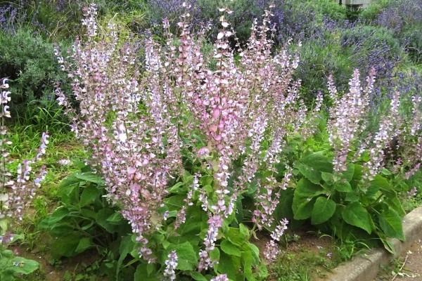 - 同じハーブガーデンに写真のような目立つハーブが咲いていました。名札を見るとクラリセージでした。ピンクの花かと思いましたが、ピンクのは苞葉で、花は薄い青い色でした。
