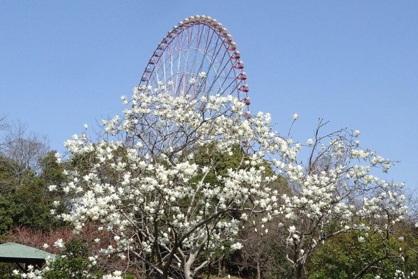 - 葛西臨海公園西側水路の池畔に大きなハクモクレンの木があります。3月16日に行くとハクモクレンは丁度満開で、バックに大観覧車が写り、映える写真になりました。