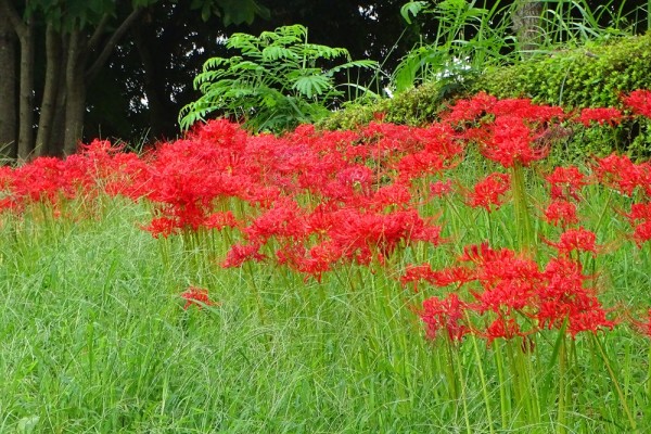 - 駅前中央通りの東側の斜面に、赤いヒガンバナが沢山咲いており、秋の景色を