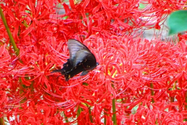 - 水路に咲いているヒガンバナに、カラスアゲハが吸蜜していました。