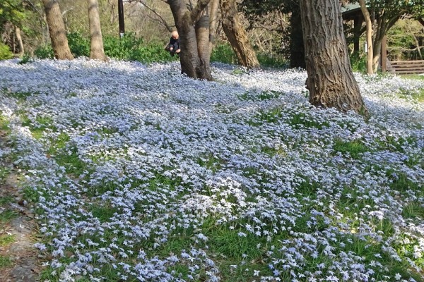 - 公園の西側の水路の樹間が、ハナニラで覆われており、薄いブルーの絨毯を敷