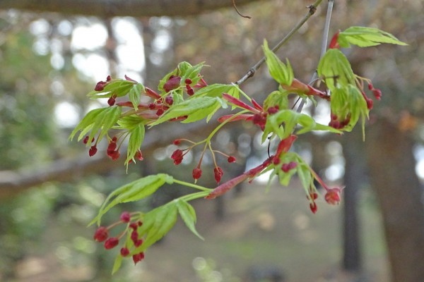 - 同じ水路近くのイロハモミジが、赤い可憐な花を咲かせていました。