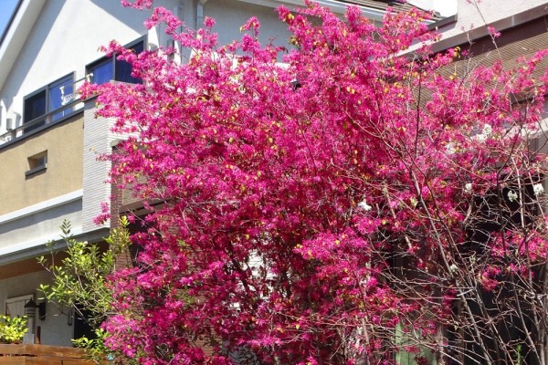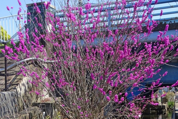 - 新川の船堀街道の脇に大きなハナズオウが満開でした。赤紫の花が木を覆うよ