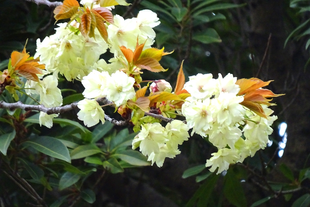 ●雷公園はギョイコウ(御衣黄)で有名です。4月16日に行って見ると咲いている枝とまだ蕾の枝があり、全体としては4分咲きといったとこでした。これも日が経つと花の芯の部分が赤くなってきます。