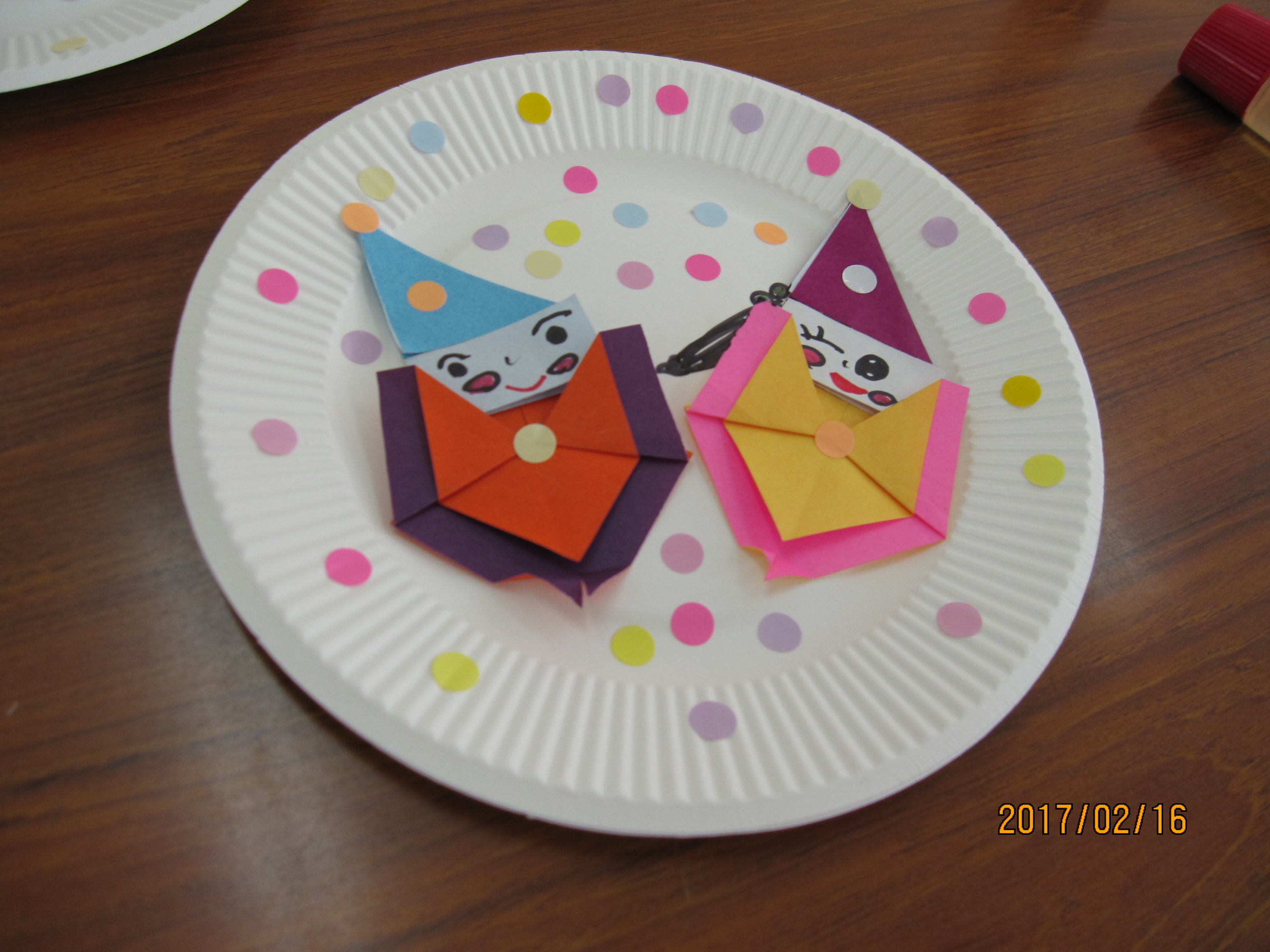 今回は、折り紙で雛人形を作り紙皿に張って、周りを飾りました。